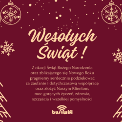 Niech tegoroczne Święta Bożego Narodzenia przyniosąZasłużony odpoczynek i wytchnienie.Dziękujemy za trud włożony w dobrą współpracę.Składamy życzenia pełnych miłości i spokoju ŚwiątOraz sukcesów osobistych i zawodowych. Zarząd i pracownicy BusWiFi Media